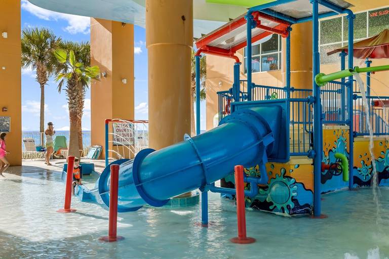 Splash Resort's amenities are quite unique among Gulf Coast resorts and there is something here for everyone. There is a heated swimming pool and Jacuzzi located right next to the main kids play area where the water slides and enormous bucket that dumps hundreds of gallons of water every 45 seconds are located. There is also a state of the art fitness facility overlooking the pool and lazy river. There is a poolside Bar and Grill with tables by the pool and a reasonably priced menu.